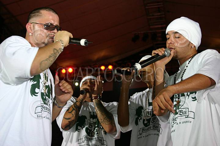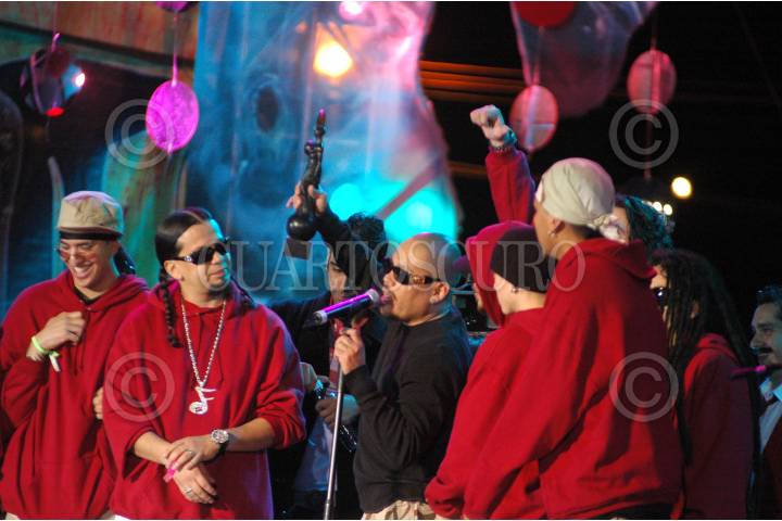 MÉXICO, D.F. 21NOVIEMBRE2005.- Nando, Pangie, Pee Wee y Abel Talamantez, integrantes del grupo Kumbia Kings, durante su presentación en el concierto Voces con Causa en el foro sol para recaudar fondos a beneficio de los damnificados por el paso del huracán Stan en Chiapas. FOTO: Iván Stephens/CUARTOSCURO.COM