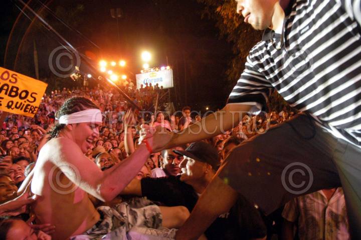 ACAPULCO, GUERRERO 19MAYO2005.- Uno de los vocalistas del grupo Kumbia Kings es practicamente resacatado de los fans luego de que en un momento de euforia se aventó al público. FOTO: Miguel Dimayuga/CUARTOSCURO.COM