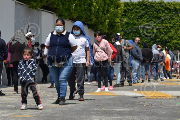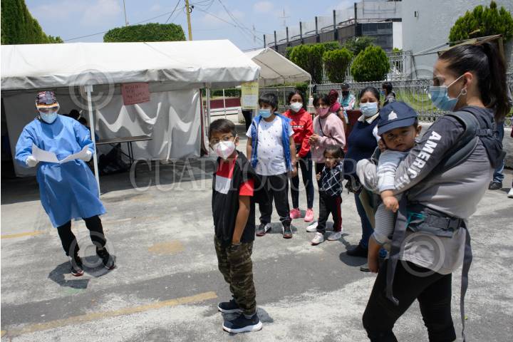 Menores de edad asisten a realizarse la prueba rápida para la detección de covid-19 en el "macro kiosko" instalado en la explanada de la alcaldía Venustiano Carranza.