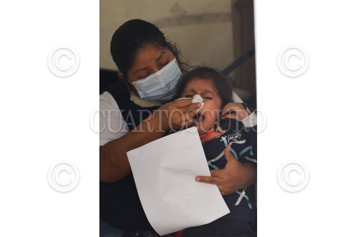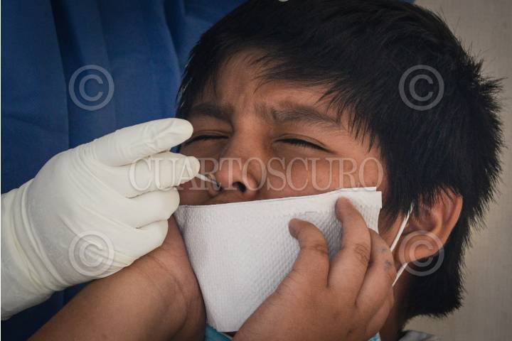 Personal de salud le practica una prueba de Covid-19 a un niño en el regazo de su mamá en el Kiosco instalado en la explanada de la Alcaldía Gustavo A. Madero, puesto que se contabilizan aumentos de casos de la variante ómicron en la población de la capital.