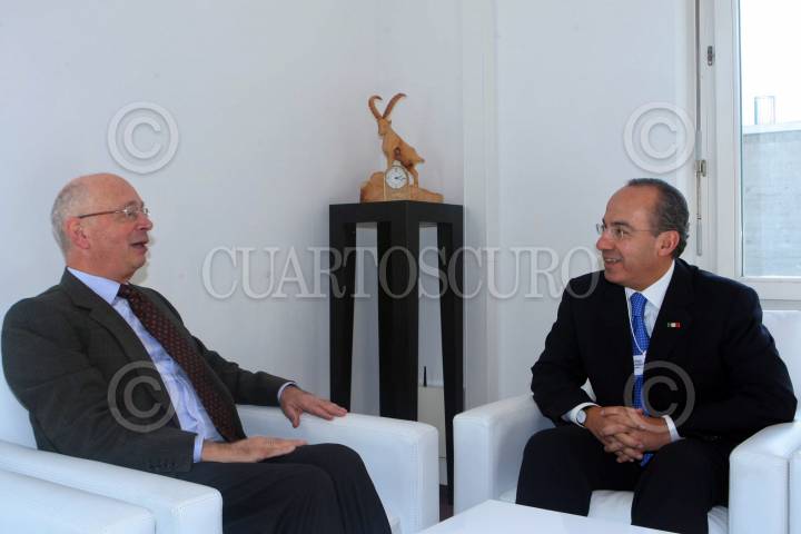DAVOS, SUIZA, 30ENERO2009.- Klaus Schwab, Presidente del foro Económico Mundial junto con Felipe Calderón, Presidente de la República conversan en el Centro de Congreso durante el Foro Economico que se dasarrolla en dicho pais. ALFREDO GUERRERO/CUARTOSCURO.COM