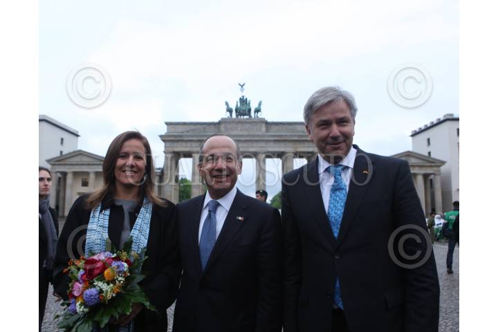 BERLIN, ALEMANIA, 03MAYO2010.- Margarita Zavala, y Felipe Calderón Hinojosa, presidente de México, junto al Alcalde de Berlin, Klaus Wowerit; durante un recorrido por la puerta de Brandenburgo. El presidente de México continúa su gira por el viejo continente. FOTO: ALFREDO GUERRERO/CUARTOSCURO.COM