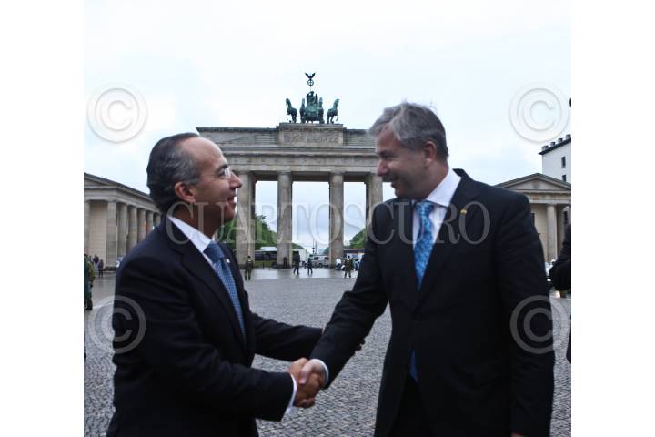 BERLIN, ALEMANIA, 03MAYO2010.- Felipe Calderón Hinojosa, presidente de México, saluda al Alcalde de Berlin, Klaus Wowerit; durante un recorrido por la puerta de Brandenburgo. El presidente de México continúa su gira por el viejo continente. FOTO: ALFREDO GUERRERO/CUARTOSCURO.COM