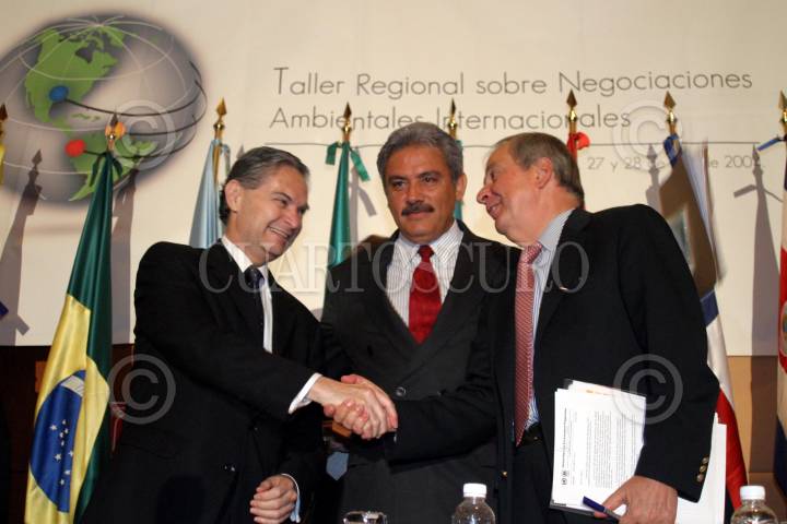 México, D.F. 27 JULIO 2004.- Luis Ernesto Derbez, secretario de Relaciones Exteriores, Alberto Cárdenas Jiménez, secretario de Medio Ambiente y Recursos Naturales y Klaus Toepfer, director ejecutivo de Naciones Unidas para el medio ambiente, se saludan antes de de inicair el taller Regional sobre negaciaciones ambientales internacionales, realizado en un hotel de la ciudad. FOTO: Sandra Perdomo/CUARTOSCURO.COM