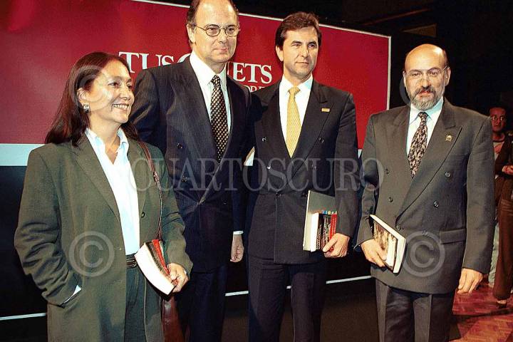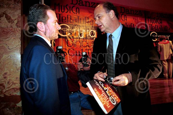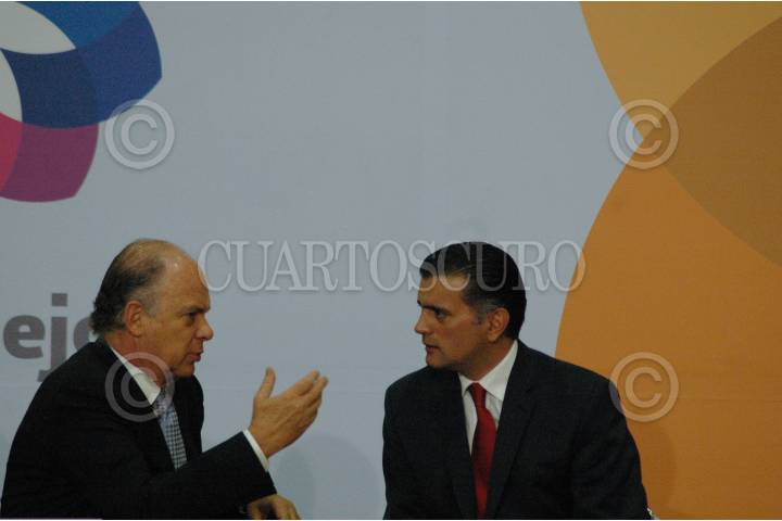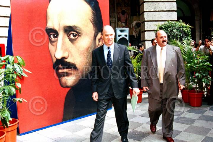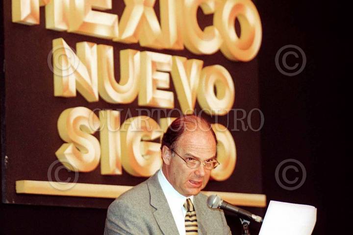 Santiago Creel Miranda y Enrique Krauze antes de la presentación de la propuesta cultural al presidente electo Vicente Fox. FOTO: Pedro Mera/CUARTOSCURO.COM