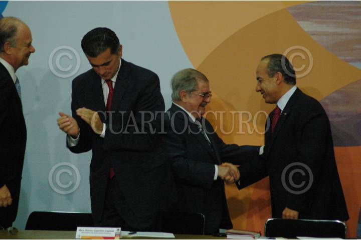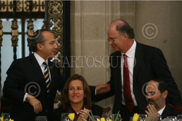 MÉXICO, D.F., 09ENERO2009.- Felipe Calderon Presidente de México, saluda al historiador Enrique Krauze Kleinbort durante la comida de trabajo con motivo de la XX reunión de embajadores y cosules de México realizada el salon tesoreria de Palacio Nacional. FOTO:SÁSHENKA GUTIÉRREZ/CUARTOSCURO.COM