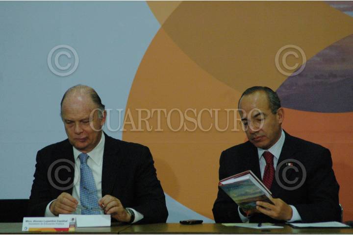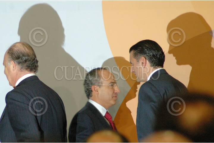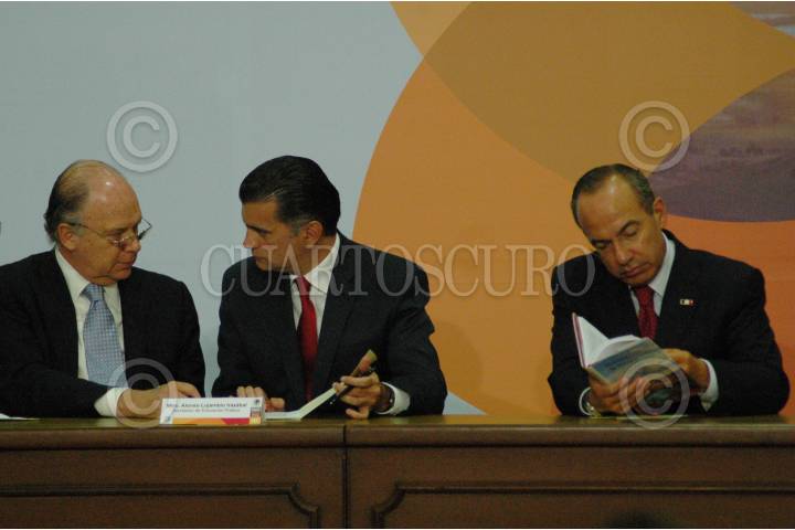 MÉXICO, D.F., 23ABRIL2010.- Enrique Krauze Kleinbort, historiador; Felipe Calderón Hinojosa, presidente de México; y Alonso Lujambio Irazábal, Secretario de Educación Pública; estuvieron presentes en el lanzamiento del libro historia de México en la residencia oficial de Los Pinos. FOTO: IVAN STEPHENS/CUARTOSCURO.COM
