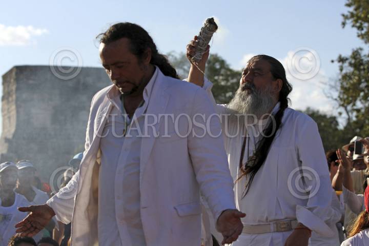 CHICHENITZA, QUINTANA ROO 21MARZO2012.- Visitantes locales y extranjeros asisten a la zona arqueológica de Chichen Itzá para dar la bienvenida a la primavera y presenciar el fenomeno astroarqueológico de luz y sobra; en el cual la luz solar forma una figura de kukulkán encarnado en una serpiente, descendiendo de las escalinatas del castillo de Chichen Itzá. FOTO: FRANCISCO BALDERAS /CUARTOSCURO.COM