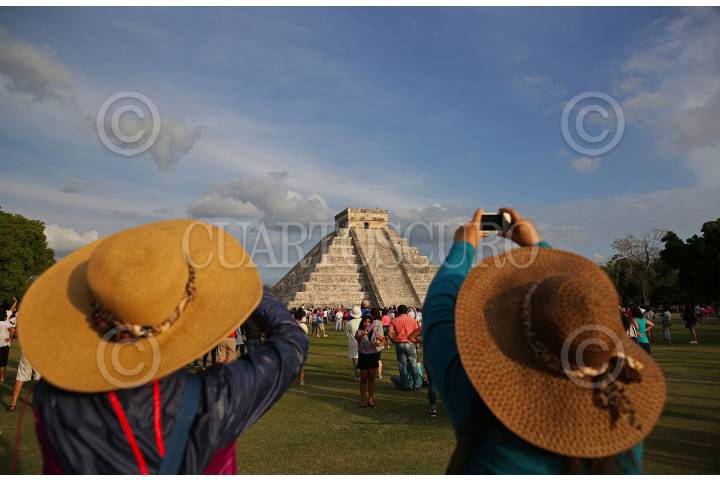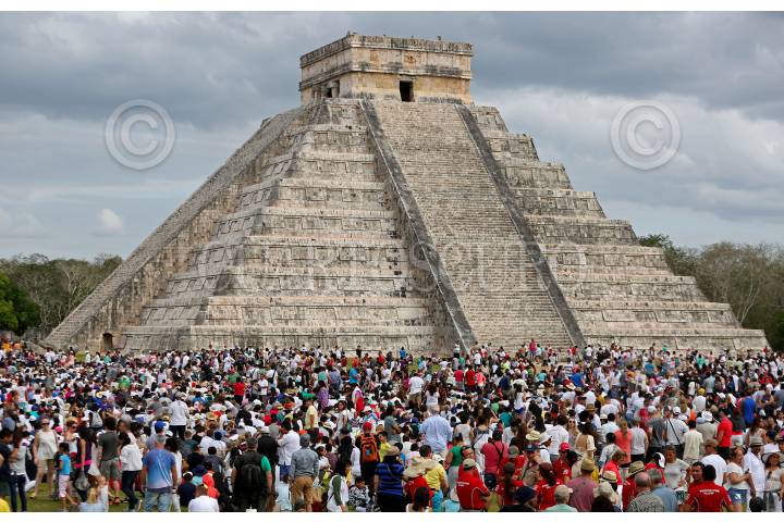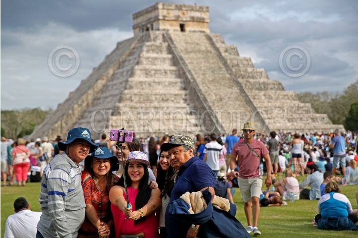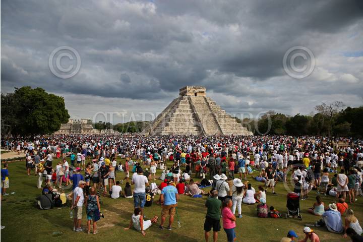 CHICHEN ITZÁ, YUCATAN, 21MARZO2016.- Unas 15 mil personas se dieron cita en la zona arqueológica de Chichen Itzá para presenciar el fenómeno de luz y sombra del equinoccio de primavera el cual se observó muy poco debido a los nublados que trajo consigo el frente frío número 49. FOTO: FRANCISCO BALDERAS / CUARTOSCURO.COM