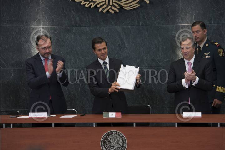 CIUDAD DE MÉXICO, 28ABRIL2017.- Enrique Peña nieto, presidente de la República, Luis Videgaray, secretario de Relaciones Exteriores, y José Antonio Meade Kuribreña, secretario de Hacienda y Crédito Público, durante la ceremonia de Reconocimiento al Servicio Exterior Mexicano. FOTO: TERCERO DÍAZ /CUARTOSCURO.COM