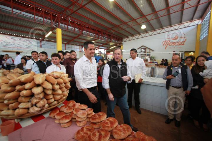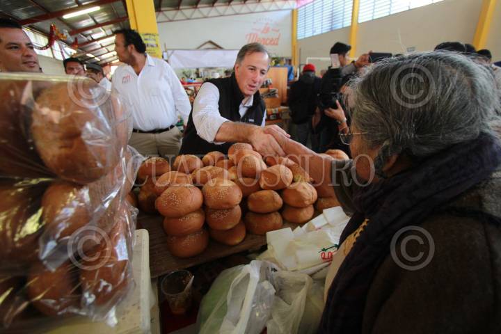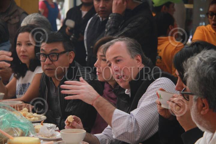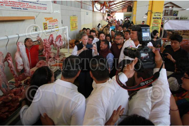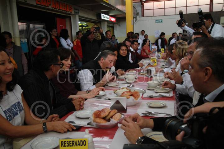 OAXACA, OAXACA, 04FEBRERO2018.- El precandidato ala presidencia de la República por la coalición "Todos por México", José Antonio Meade y su esposa Juana Cuevas realizan este domingo una gira de trabajo por el estado de Oaxaca, durante su recorrido visitó el mercado de La Merced, donde desayunó junto con el gobernador, Alejandro Murat y diversos funcionarios públicos y artistas plásticos. Meade únicamente tomó un chocolate de leche con pan y un jugo. FOTO: ARTURO PÉREZ ALFONSO/ CUARTOSCURO.COM