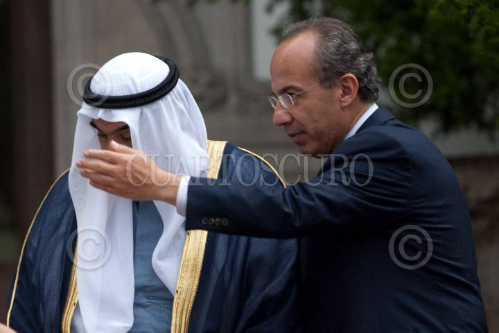 MÉXICO, D.F., 15JULIO2010.- Jeque Nasser Al-Sabah, primer ministro de Kuwait, y Felipe Calderón Hinojosa, presidente de México, ofrecieron un mensaje a los medios de comunicación y firmaron un acuerdo de cooperación entre ambos países. Esto, se realizó en la escalinata de la Casa Miguel Alemán de la Residencia Oficial de Los Pinos. FOTO: MISAEL VALTIERRA/CUARTOSCURO.COM