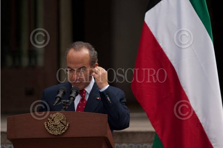 MÉXICO, D.F., 15JULIO2010.- Felipe Calderón Hinojosa, presidente de México, ofreció un mensaje a los medios de comunicación junto con Jeque Nasser Al-Sabah, primer ministro de Kuwait, donde también se firmó un acuerdo de cooperación entre ambos países. Esto, se realizó en la escalinata de la Casa Miguel Alemán de la Residencia Oficial de Los Pinos. FOTO: MISAEL VALTIERRA/CUARTOSCURO.COM