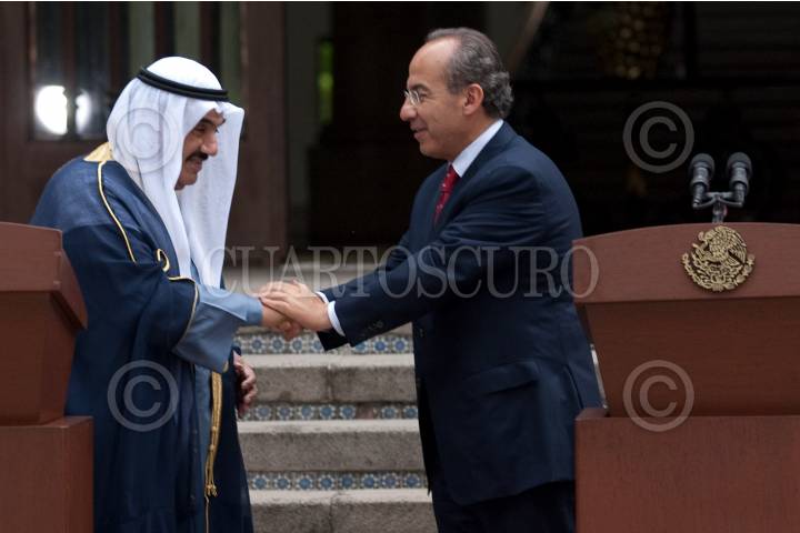 MÉXICO, D.F., 15JULIO2010.- En la escalinata de la Casa Miguel Alemán de la Residencia Oficial de Los Pinos, el primer ministro de Kuwait, Jeque Nasser Al-Sabah, y Felipe Calderón Hinojosa, presidente de México, ofrecieron un mensaje a los medios de comunicación y firmaron un acuerdo de cooperación entre ambos países. FOTO: MISAEL VALTIERRA/CUARTOSCURO.COM
