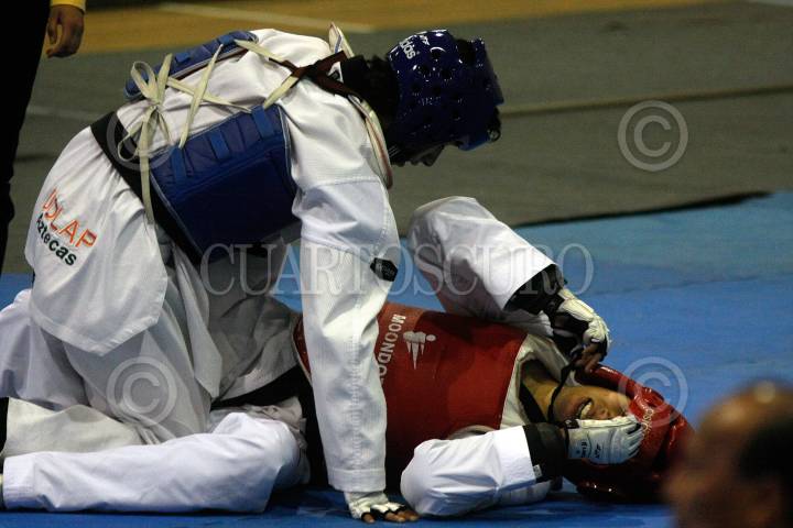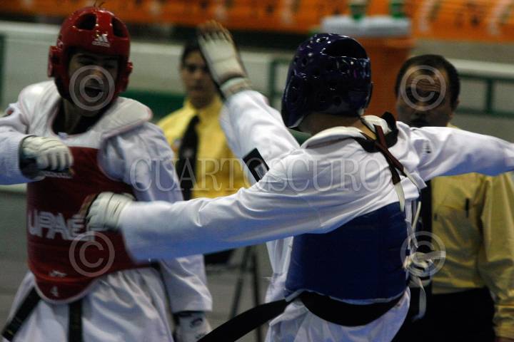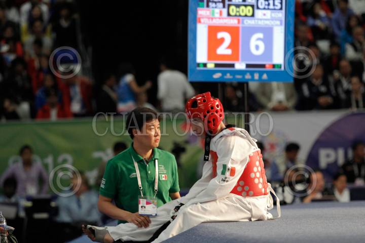 PUEBLA, PUEBLA, 15JULIO2013.- El taekwondoín mexicano Damián Villa fue derrotado por el coreano Tae-Moon Cha en ronda semifinal durante el primer día de actividades del Campeonato Mundial de Taekwondo 2013 realizado en la ciudad de Puebla. FOTO: HILDA RIOS /CUARTOSCURO.COM