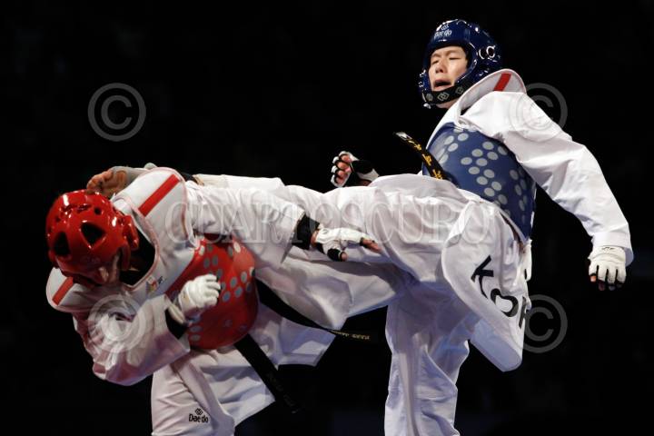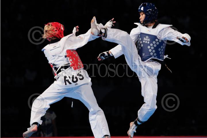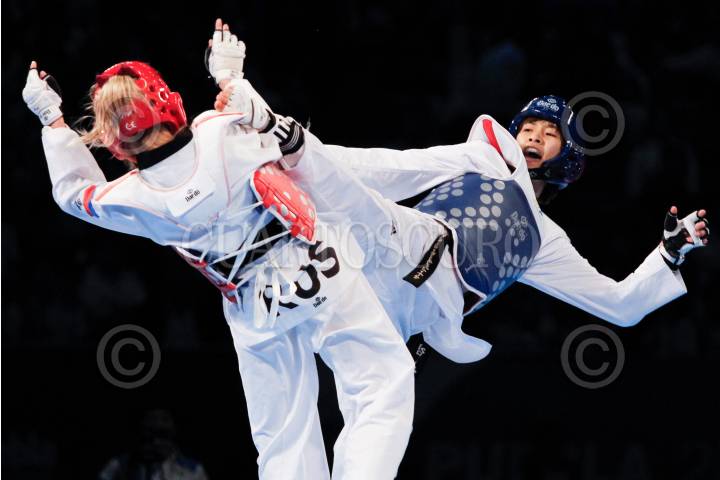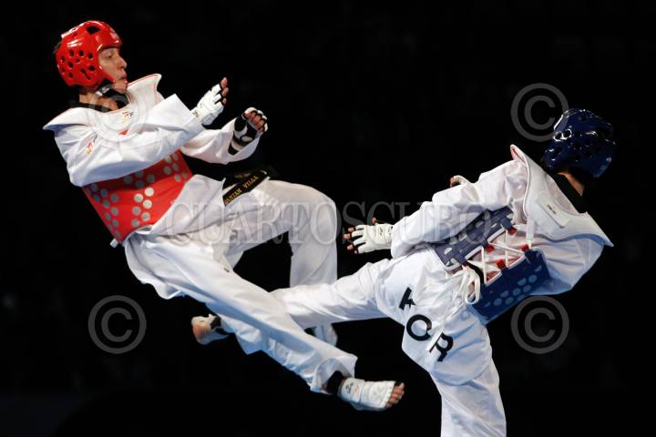 PUEBLA, PUEBLA, 15JULIO2013.- La Coreana Kim So-Hui se llevó la medalla de oro al vencer a la rusa Anastasia Valueva, en el primer día de actividades del Campeonato Mundial de Taekwondo 2013 realizado en la ciudad de Puebla. FOTO: HILDA RIOS /CUARTOSCURO.COM
