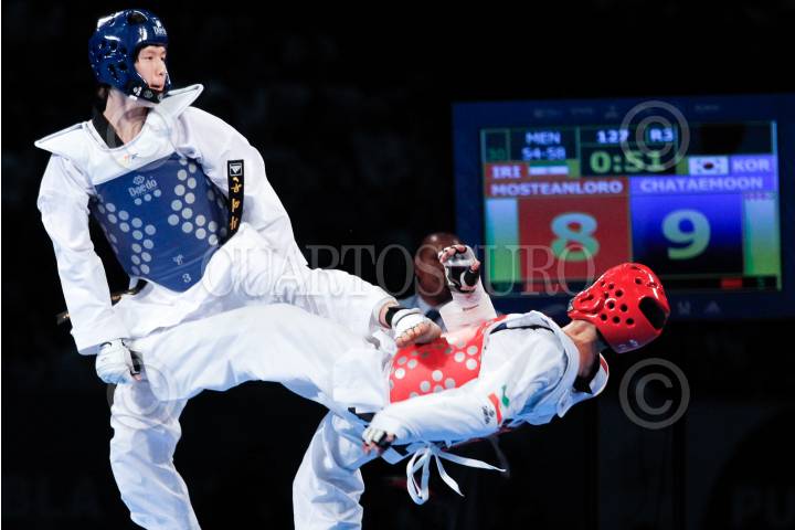 PUEBLA, PUEBLA, 15JULIO2013.- El coreano Tae-Moon Cha se llevó la medalla de oro al vencer al iraní Hadi Mostean Loron, en el primer día de actividades del Campeonato Mundial de Taekwondo 2013 realizado en la ciudad de Puebla. FOTO: HILDA RIOS /CUARTOSCURO.COM