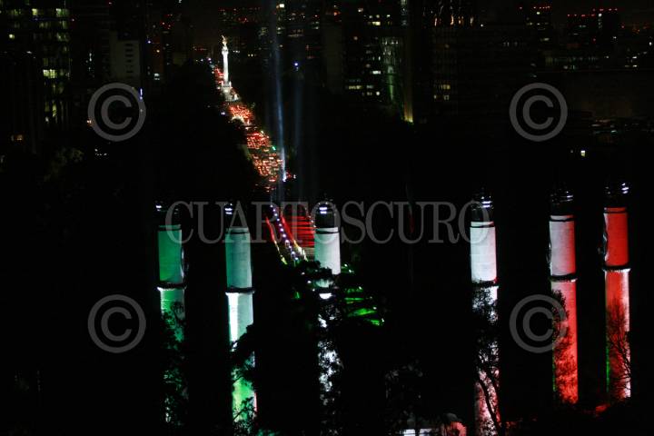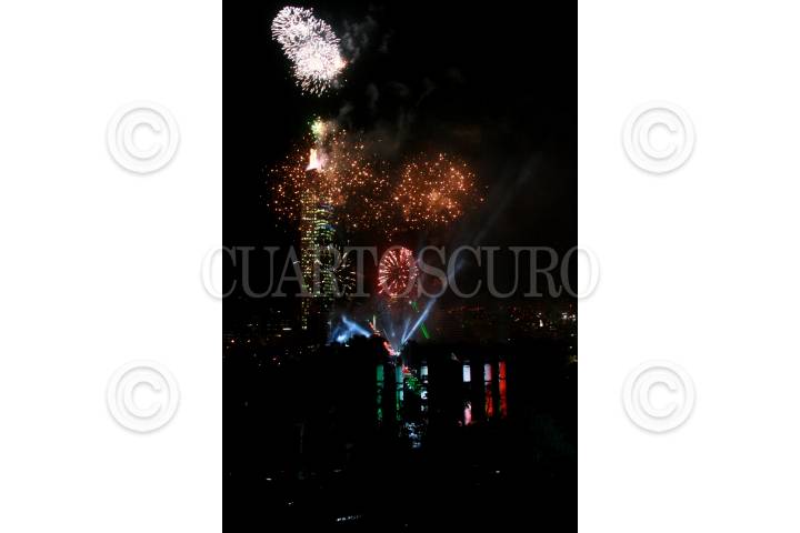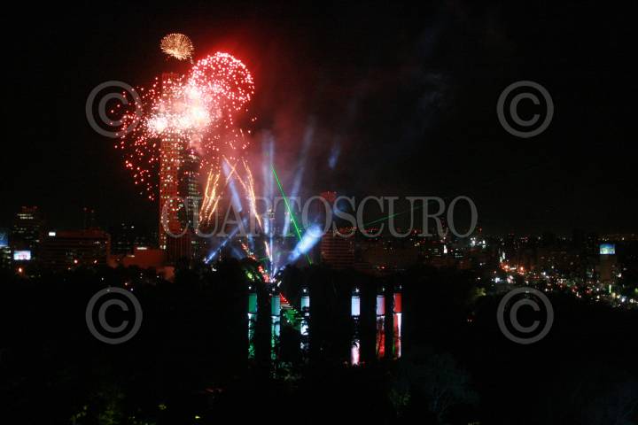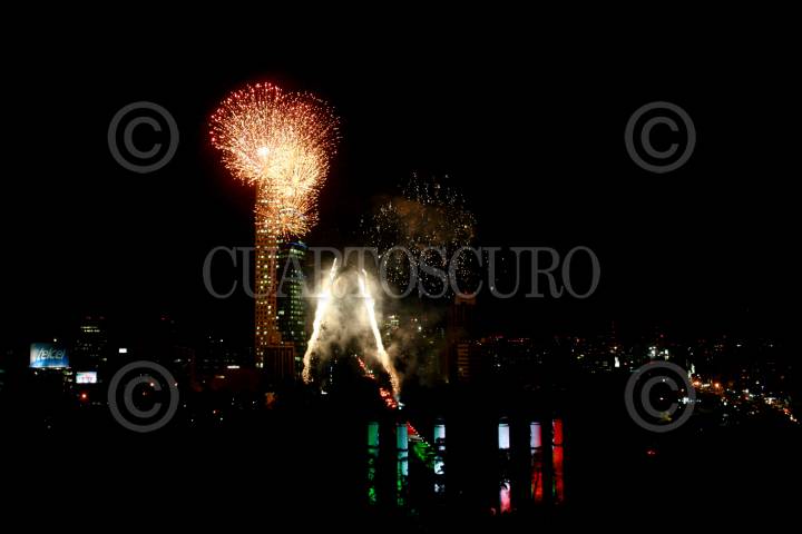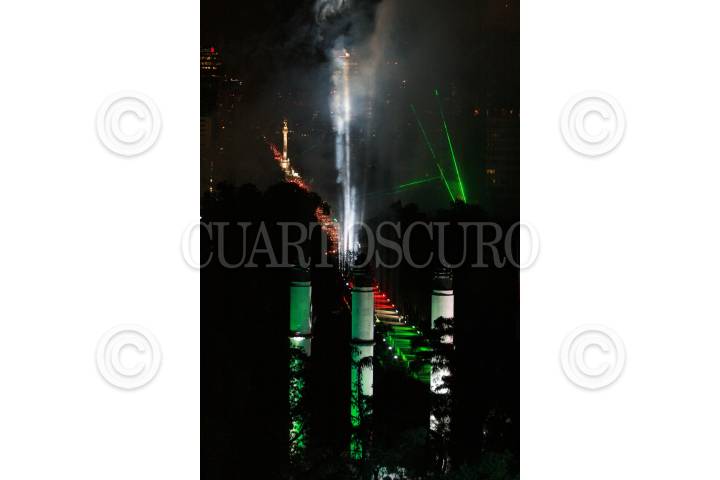 MÉXICO, D.F., 26ENERO2009.- Felipe Calderon Hinojosa presentó esta noche el anuncio de la convocatoria del monumento emblematico arco del bicentenario, la presentación se realizo con juegos pirotecnicos y rayos laser que alumbraban la torre mayor y el monumento a los niños heroes. FOTO: SÁSHENKA GUTIÉRREZ/CUARTOSCURO.COM