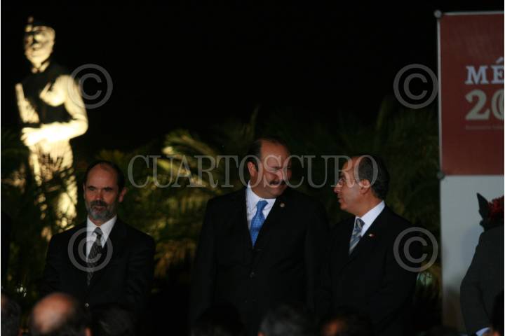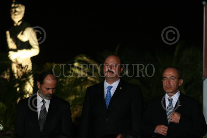 MÉXICO, D.F., 26ENERO2009.- Felipe Calderon Hinojosa Presidente de México, Gustavo Madero Presidente de la Mesa Directiva del Senado de la República y César Duarte Jáquez. Presidente de la Mesa Directiva de la Cámara de Diputados, presentó esta noche el anuncio de la convocatoria del monumento emblematico arco del bicentenario, la presentación se realizo en el Castillo de Chapultepec con juegos pirotecnicos y rayos laser que alumbraban la torre mayor y el monumento a los niños heroes. FOTO: SÁSHENKA GUTIÉRREZ/CUARTOSCURO.COM