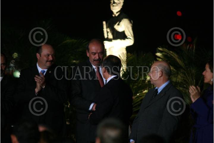 MÉXICO, D.F., 26ENERO2009.- Felipe Calderon Hinojosa Presidente de México saluda a Jose ángel Ávila Secretario de Gobierno del Distrito Federal durante la presentación de la convocatoria del monumento emblematico arco del bicentenario, la presentación se realizo en el Castillo de Chapultepec con juegos pirotecnicos y rayos laser que alumbraban la torre mayor y el monumento a los niños heroes. FOTO: SÁSHENKA GUTIÉRREZ/CUARTOSCURO.COM