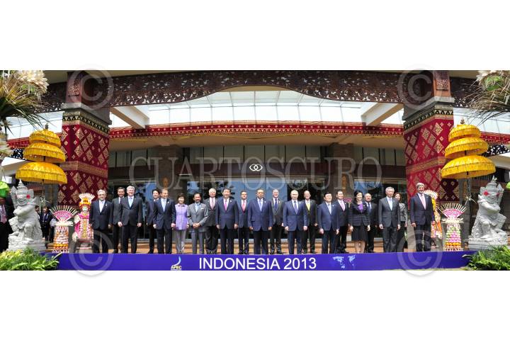 BALI, INDONESIA, 08OCTUBRE2013.- En su segundo día de actividades en la Reunión de Líderes del Foro de Cooperación Económica Asia-Pacífico (APEC) 2013, Enrique Peña Nieto, presidente de México, participó en la fotografía oficial de los líderes, previo al Segundo Retiro con el tema: Visión de APEC sobre la conectividad en la cambiante arquitectura regional e internacional. FOTO: PRESIDENCIA /CUARTOSCURO.COM