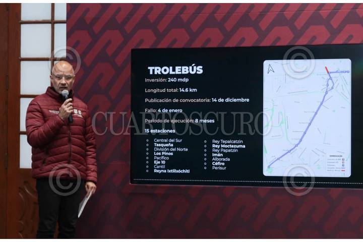 CIUDAD DE MÉXICO, 07DICIEMBRE2023.- Antonio Esteva titular de Obras y el titular de Movilidad; Andrés Lajous acompañaron al jefe del Gobierno de la Capital, Martí Batres Guadarrama en la Presentación del Proyecto de la línea 12 del Trolebús en Avenida Aztecas, al sur de la Ciudad en la alcaldía Coyoacán. FOTO: GOBIERNO DE LA CIUDAD/CUARTOSCURO.COM