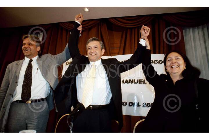 Carlos Imaz presidente estatal, Andrés Manuel López Obrador candidato al gobierno del D.F. y Amalia García presidenta nacional del PRD, festejan el triunfo del abanderado perredista en el primer debate que sostuvieron los abanderados del PRD, PAN y PRI en el club de industriales.