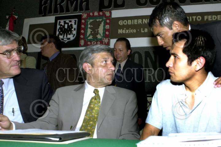 Andrés Manuel Lopéz Obrador, jefe de Gobierno del DF, Nelsón Vargas, presidente de la CONADE y Bernardo Segura, director del Instituto del Deporte del DF, firmaron un convenio para para mejorar el deporte, tambien estuvo presente el campeon de Box, Marco Antonio Barrera. FOTO:Oswaldo Ramirez/CUARTOSCURO.COM