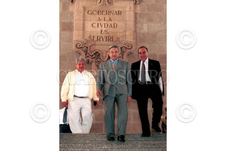 En el Antiguo Colegio de Jurisprudencia, Andrés Manuel López Obrador, junto con Juan Ramón de la Fuente, rector de la Universidad Nacional Autonoma de México (UNAM) y Marcelo Ebrard secretario de Seguridad Pública del D.F, firmaron un convenio de colaboración para capacitar a los elementos de la policia auxiliar. FOTO: Antonio González/CUARTOSCURO.COM