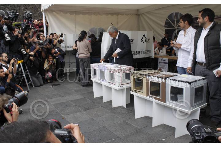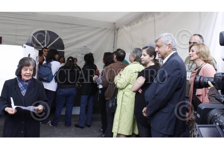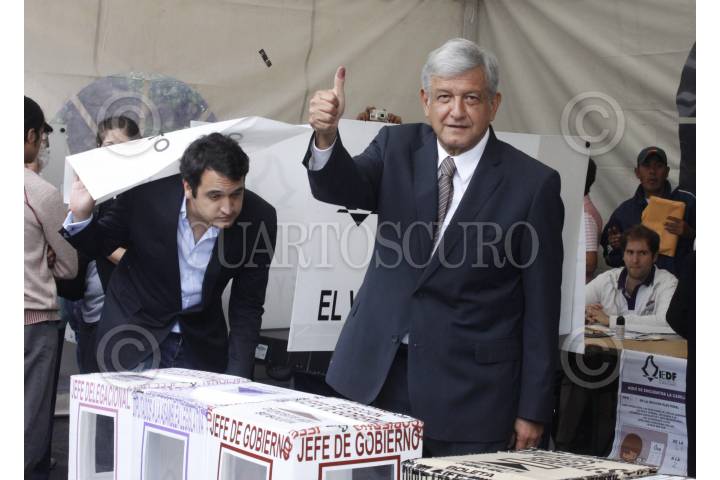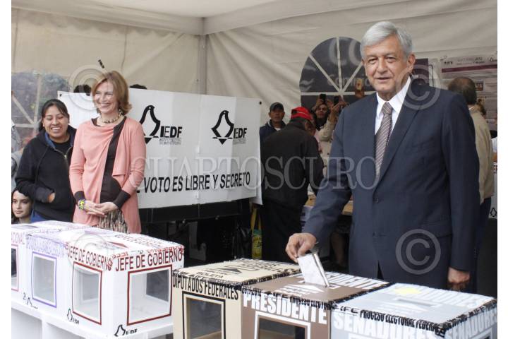 MÉXICO, D.F., 01JULIO2012.- Andrés Manuel López Obrador, candidato del Movimiento Progresista a la presidencia de la república, acompañado de su esposa Beatriz Gutiérrez, emitió su voto en la casilla 359 del edificio de la Comisión Nacional del Agua. Sus hijos Gonzalo y José Ramón acudieron a las urnas. FOTO: CUARTOSCURO.COM