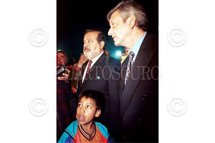 Andrés Manuel Lopéz Obrador, jefe de Gobierno del DF y el empresario Carlos Slim miembro del patronato para el Centro Historico son acompañados por un niño de la calle. FOTO: Eunice Adorno/CUARTOSCURO.COM