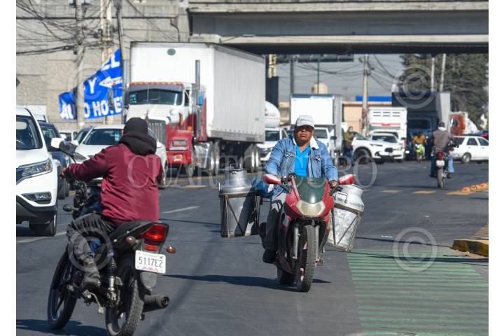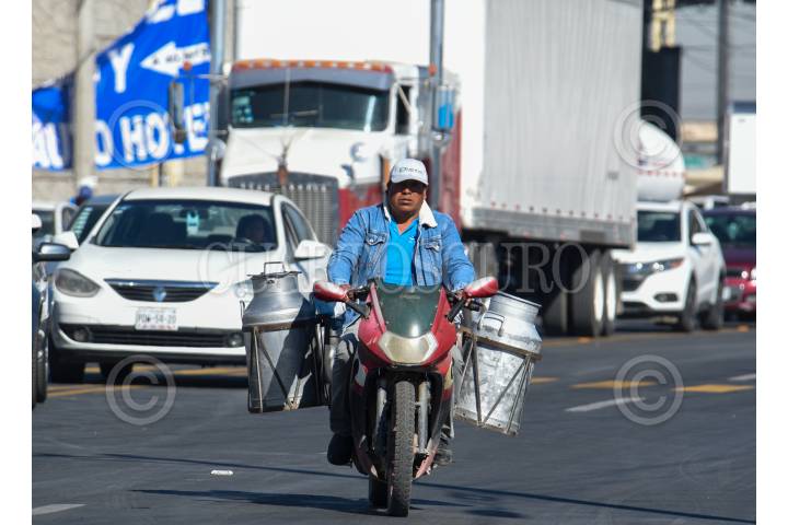 Un hombre entrega leche utilizando una motocicleta, dejando a un lado los anteriores transportes como carreta jalada por animales y camionetas.