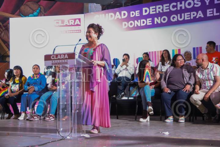 CIUDAD DE MÉXICO. 17MAYO2024.- la candidata de la Coalición Sigamos Haciendo Historia, clara Brugada Molina; se reunió con la comunidad de la diversidad sexual y encabezó el encuentro “Ciudad de Derechos y Libertades Donde no Quepa el Odio”. Teatro Popular “Hermanos Soler”, de la alcaldía Benito Juárez. FOTO: VICTORIA VALTIERRA/CUARTOSCURO.COM