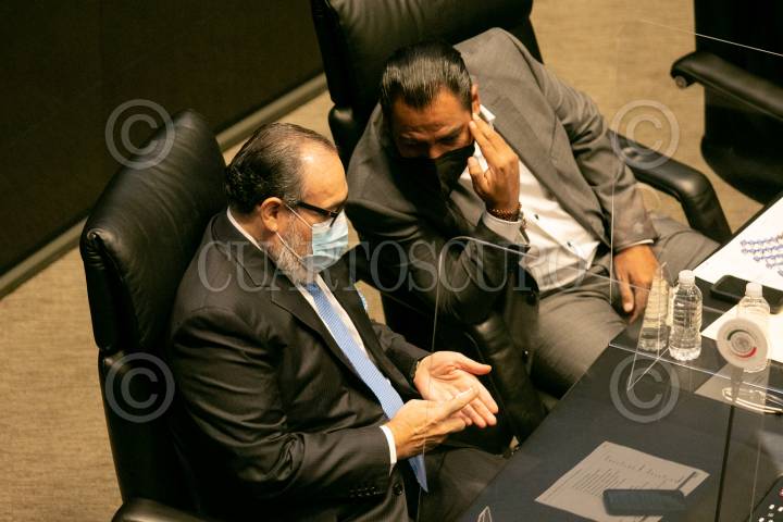 Carlos Marín (PRI), vicepresidente de la Mesa Directiva, conversa con Oscar Ramírez (Morena), presidente de la mesa, durante la sesión ordinaria.