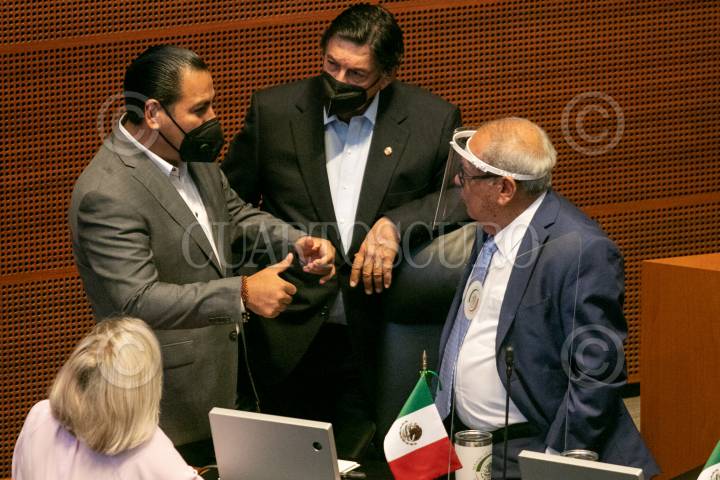 Oscar Ramírez (Morena), presidente de la mesa directiva, conversa con los senadores Napoleón Gómez Urrutia y Ostoa Ortega Anival, durante la sesión ordinaria.