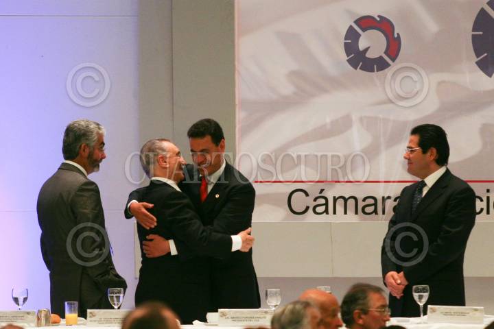 MEXÍCO D.F. 04MARZO2008.-El presidente, Felipe Calderón, acudio a un desayono con integrantes de la CANACINTRA con motivo de la inauguración de la LXVII Asamblea General Ordinaria de esta asociación.En la Imagen es acompañado por Ismael Hernádez gobernador del Estado de Durango, Miguel Maron Manzur, presidente de la Cámara de CNACINTRA y por Geogina Keccel titular de la Secretaría de Energía. FOTO: GUILLERMO PEREA/CUARTOSCURO.COM