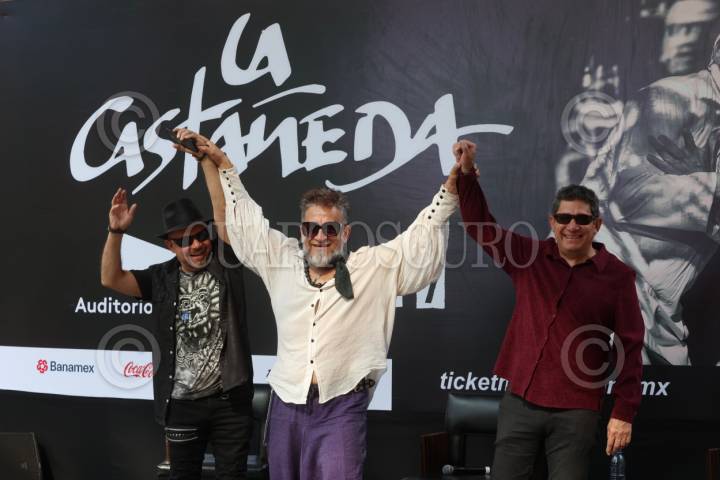 CIUDAD DE MÉXICO, 23ABRIL2025. La Castañeda, banda conformada por Salvador Moreno y los hermanos De León, Oswaldo y Omar, en conferencia de prensa donde anunciaron su próxima fecha de concierto en el Auditorio Nacional; con el que dicho por ellos mismos se retiran de la escena musical para dedicarse a otros proyectos. FOTO: EDGAR NEGRETE LIRA/CUARTOSCURO.COM
