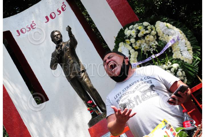 CIUDAD DE MÉXICO, 20ABRIL2025.- Homenaje a José José frente a la escultura del cantautor mexicano, en el parque de La China, donde decenas de sus fanáticos entonaron sus mayores éxitos. FOTO: DANIEL AUGUSTO/ CUARTOSCURO.COM
