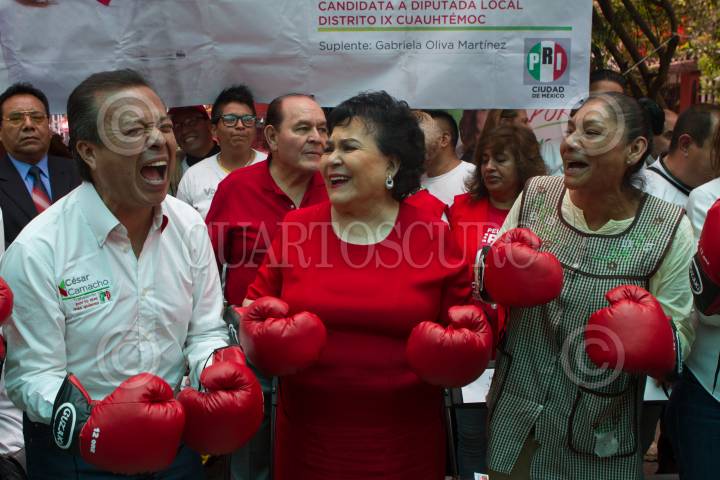 MÉXICO, D.F., 03JUNIO2015.- César Camacho, dirigente nacional del PRI, la actriz Carmen Salinas, candidata priista a una diputación familiar y Lourdes Ruiz, mejor conocida como la "Reina del albur", durante un evento en la unidad habitacional La Fortaleza, ubicada en el barrio de Tepito, en donde la candidata tricolor Cynthia López Castro cerro su campaña con miras a ocupar un lugar ALDF. FOTO: MOISÉS PABLO /CUARTOSCURO.COM