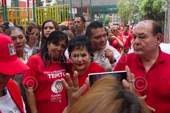 MÉXICO, D.F., 03JUNIO2015.- Lourdes Ruiz, mejor conocida como la reina del albur, Carmen Salinas, actriz y candidata priista a una diputación federal, Cynthia López Castro, candidata tricolor a la ALDF, César Camacho Quiroz, dirigente nacional del PRI y Mauricio López, dirigente local del tricolor, durante un evento proselitista en la unidad habitacional La Fortaleza, ubicada en el barrio de Tepito. FOTO: MOISÉS PABLO /CUARTOSCURO.COM