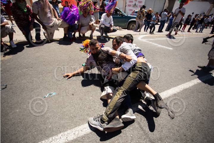HUEJUQUILLA EL ALTO, JALISCO, 31MARZO2024.- Antes de emprender la subida a la Sierra Wixárika, en el inicio de la Sierra Madre Occidental, se juntan los estados de Jalisco, Zacatecas, Nayarit y Durango; aqui tiene cabida "La Judea", sin Cristo ni cruz, sólo “borrados”, hombres que pintan todo su cuerpo, eliminando su personalidad, y representan a los judíos. Esta Judea tiene elementos de distintas culturas, en que se mezclan, por supuesto, la tradición católica, la penitencia pública y las creencias de los pueblos originarios, en particular la wixárika y tepehua. Todo el pueblo y el turismo se reúne en el centro del pueblo para presenciar y recibir, uno que otro chicotazo, sus tradiciones y que año con año se dan cita disfrazados para llevar a cabo la celebración. La fiesta principal se ralizá el viernes santo, los borrados inician el acto saliendo a la plaza principal corriendo con enormes sombreros de cartulina multicolor. Son los judíos, quienes con algarabía van “agarrando” a la gente para pedir una cooperación para la fiesta, todo bajo el control de los "cueros de cochino", otros borrados con máscara de tapir armados con un chirrión. Ahí comienzan los enfrentamientos, la gente participa en ellos, protegida por chamarras gruesas y sombreros de petate con cuero, desafían, “torean” a los borrados, nada más con un palo para defenderse de los chicotazos, representando un acto sobre la búsqueda de redención y castigo, que ejercen los látigos sobre la piel. A medio día se liberan los barrabases, personajes principales de esta historia sagrada y profana. Después de purificarse revolviéndose en jarales, se arman de látigos y, al igual que los Cueros de cochinos, son toreados por los asistentes, en la plaza principal para luego caminar, en procesión, a varios lugares del pueblo, lanzándose naranjas en un torbellino creciente de euforia y violencia. Todos estos personajes envalentonados por el tepe, bebida tradicional del lugar, un destilado de agave con peyote. En medio de toda la fiesta ronda la muerte, delgados jóvenes disfrazados, que corren durante toda la ceremonia y tocan a los asistentes como una huella de mal augurio con sus dedos pintados de negro. Poco a poco todo el pueblo es una gran fiesta de latigazos y risas. Este teatro tradicional se termina el sábado con la quema de los judas. Esta Judea es sin viacrucis ni Cristo, acá la lucha entre bien y mal se resuelve sin el redentor. FOTO: ADOLFO VLADIMIR /CUARTOSCURO.COM