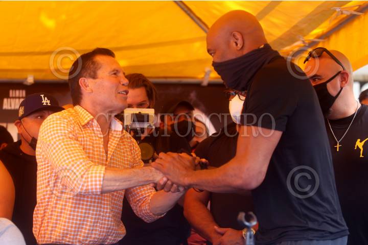 El ex boxeador Julio Cesar Chávez, saludo a Anderson Silva en la conferencia de prensa previa a la función boxística del próximo sábado en el Estadio Jalisco.