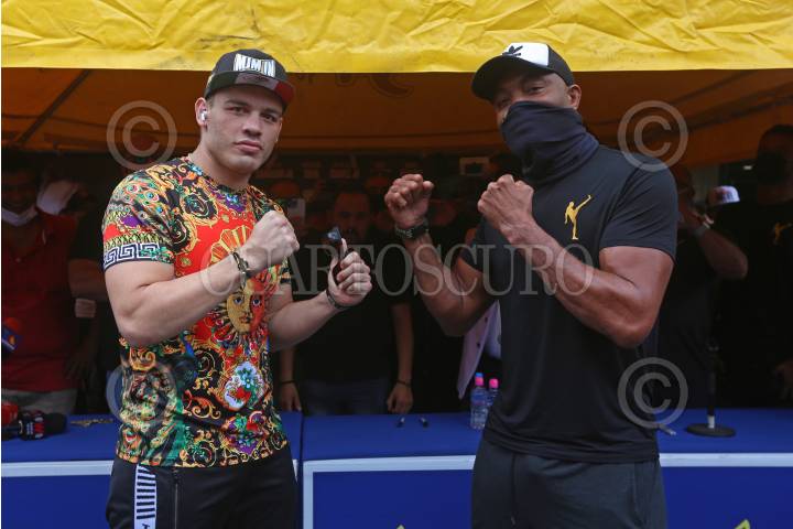 Julio Cesar Chávez Jr., se toma la fotografía con su rival Anderson Silva, en la conferencia de prensa previa a la función boxística del próximo sábado en el Estadio Jalisco.