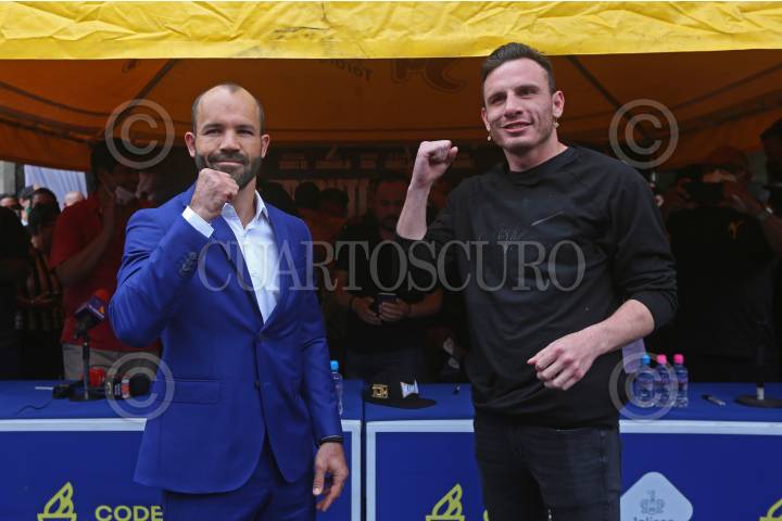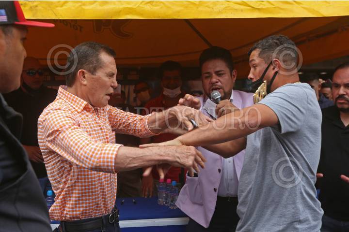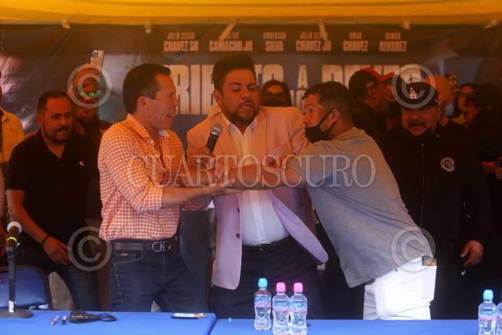 Julio Cesar Chávez, durante la fotografía con su rival Macho Camacho Jr., tuvieron una inesperada confrontación en la conferencia de prensa previa a la función boxística del próximo sábado en el Estadio Jalisco.