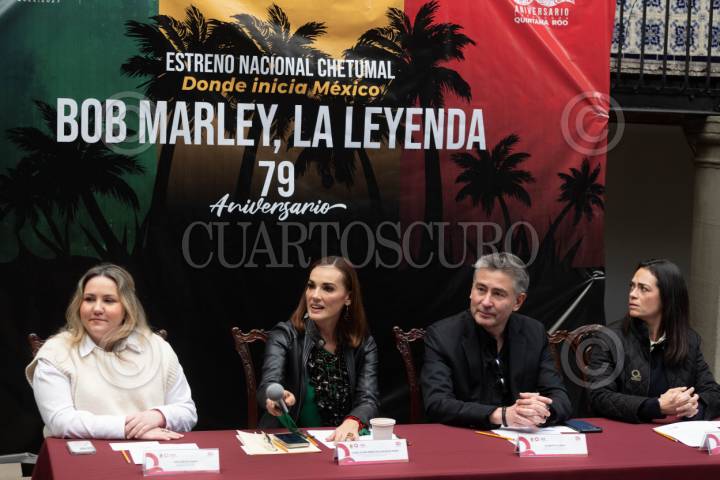 CIUDAD DE MÉXICO, 30ENERO2024.- Ana Belén Mier Publicity Manager Paramount Pictures; Lilian Jesús Villanueva Cha, Directora del Instituto de la Cultura y las Artes de Quintana Roo; Alberto Llera, Director de Marqueting de Paramount Pictures en México y Fernanda Ruíz de Velasco, Directora de Información Relaciones Públicas y Cultura durante la conferencia de prensa por el estreno nacional en la ciudad de Chetumal en Quintana Roo, de la película "Bob Marley, La Leyenda", como parte de disversas actividades culturales por el 79 aniversario del natalicio del musico. FOTO: EDGAR NEGRETE LIRA/CUARTOSCURO.COM