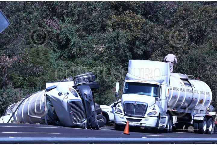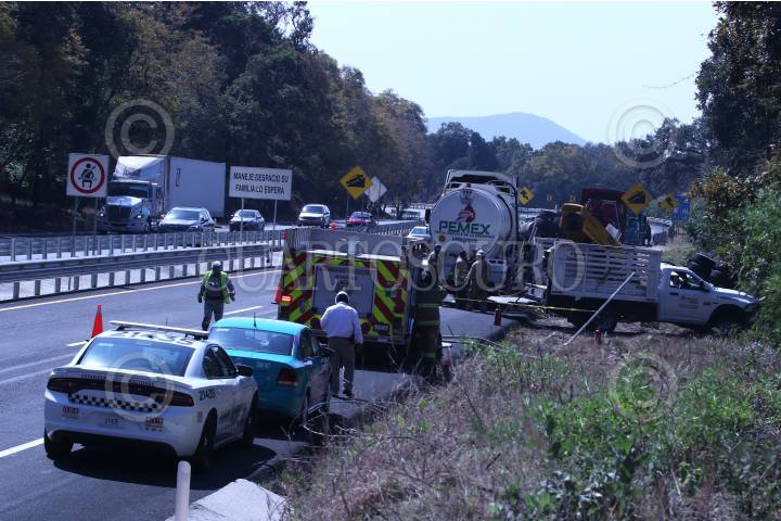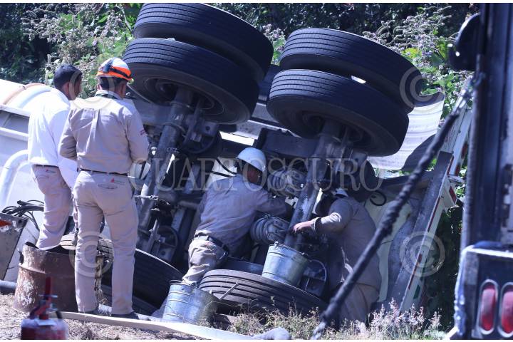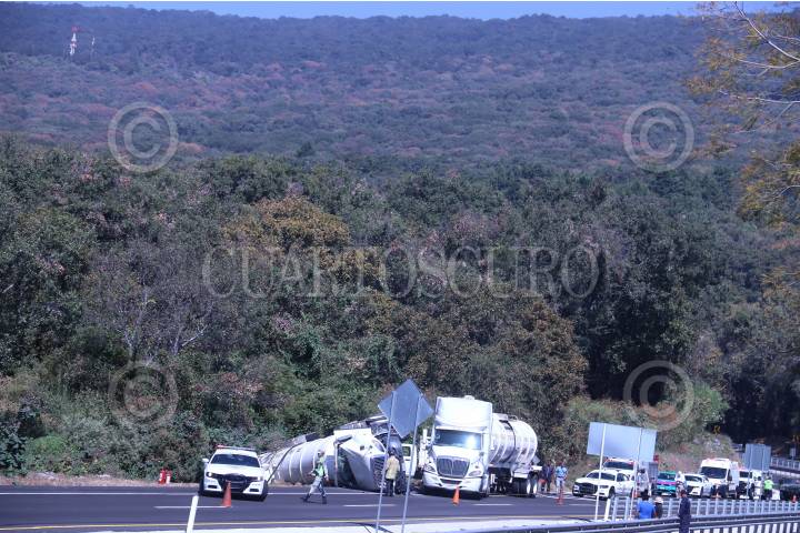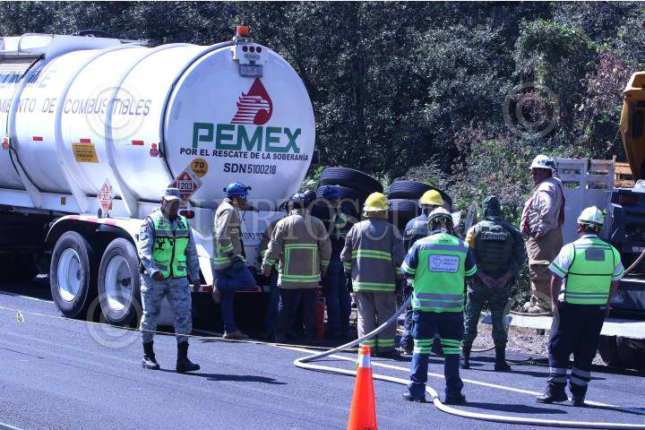 Una pipa de PEMEX que transportaba gasolina se volcó al amanecer de este día en el kilómetro 5 de la autopista La Pera-Cuautla, afortunadamente no hubo pérdidas humanas que lamentar.