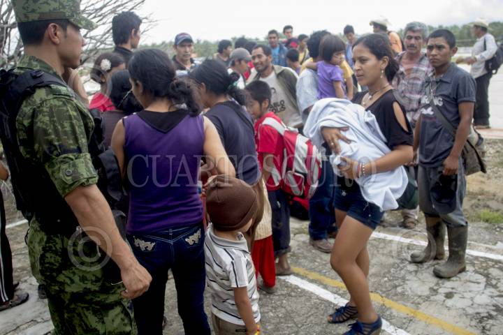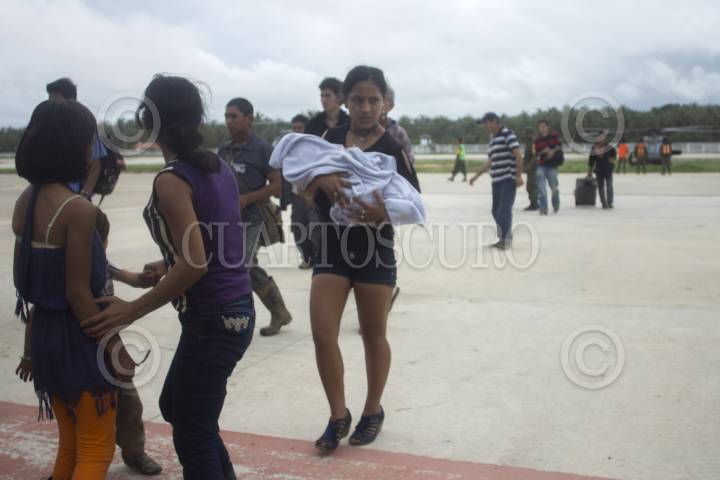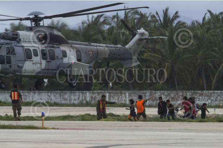 ACAPULCO, GUERRERO, 19SEPTIEMBRE2013.- Familias provenientes de la colonia “La Pintada” la cual sufrio un alud de tierra el cual versiones apuntan a que hay mas de 60 personas desaparecidas. Las familias llegaron a bordo de un helicóptero de la Fuerza Aerea Mexicana a la Base Militar ubicada en Pie de la Cuesta. FOTO: ENRIQUE ORDÓÑEZ /CUARTOSCURO.COM