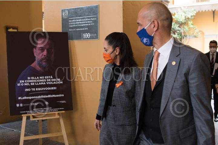 Claudia Sheinbaum, Jefa de Gobierno, y Salvador Guerrero Chiprés, presidente del Consejo Ciudadano para la Seguridad y Justicia de la Ciudad de México, observan un cartel de la campaña contra la violencia sexual "La Responsabilidad es Nuestra".