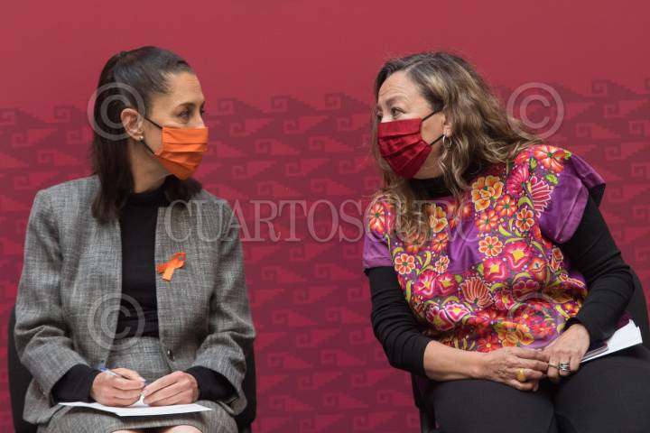Claudia Sheinbaum, Jefa de Gobierno, e Ingrid Gómez Saracíbar, titular de la Secretaría de las Mujeres, durante la presentación de la campaña contra la violencia sexual "La Responsabilidad es Nuestra".