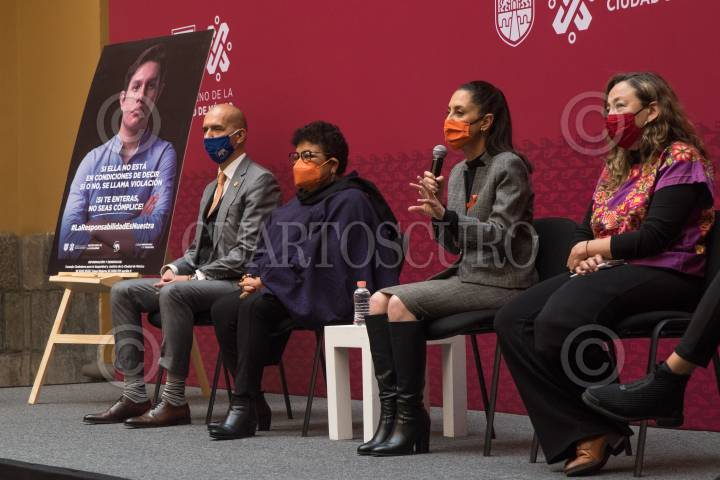 Salvador Guerrero Chiprés, Ernestino Godoy, Claudia Sheinbaum, e Ingrid Gómez Saracíbar, durante la presentación de la campaña contra la violencia sexual "La Responsabilidad es Nuestra".